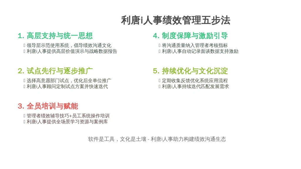 - 关键行动: 定期收集用户反馈,持续优化系统应用和绩效沟通流程。通过内部宣传、优秀案例分享等方式,逐步将主动沟通内化为组织文化。