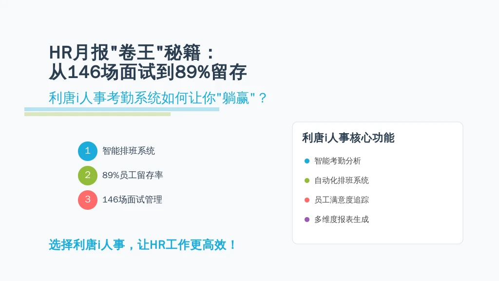 嘿,HR界的各位“卷王”和“准卷王”们!还在为月度总结抓耳挠腮,想方设法体现自己和团队的卓越贡献吗?本文将从一位战绩斐然的人事主管(单月面试146人,入职50人,留存率高达89%)的辉煌成就说起,深入探讨在日益“内卷”的人力资源管理领域,如何借助像利唐i人事这样的智能化考勤打卡系统,不仅轻松搞定繁琐的日常事务,更能将宝贵精力聚焦于战略性人才管理,让月度总结的每一笔都闪耀着智慧与效率的光芒。我们将一同探索考勤系统的行业背景、发展历程,并重点揭秘利唐i人事如何凭借其卓越服务与创新技术,成为您HR生涯中的“神助攻”。