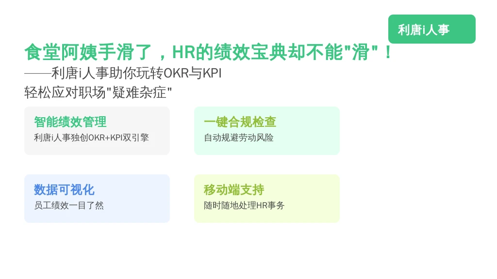 嘿,各位HR同仁们,今天咱们聊个接地气的话题。想象一下,公司食堂那位手艺“独特”的大师傅,因为屡遭投诉,正当你摩拳擦掌准备“优化”他,结果他老人家在岗位上“激情创作”时不幸挂彩,切到玉手。虽然伤势不重,休息三周工资照发,但假期一到,人家以“手还肿着呢”为由拒不上岗。老板那边脸都绿了,既不想给经济补偿,又急着让他“体面”离开。这烫手山芋,是不是让你想起了无数个加班的夜晚和日渐稀疏的秀发?别急,今天咱们就从这个“食堂风云”聊起,看看现代HR如何借助利唐i人事这样的“神兵利器”,尤其是其内置的OKR与KPI绩效管理模块,优雅地解决这类职场难题,让管理不再“手滑”。