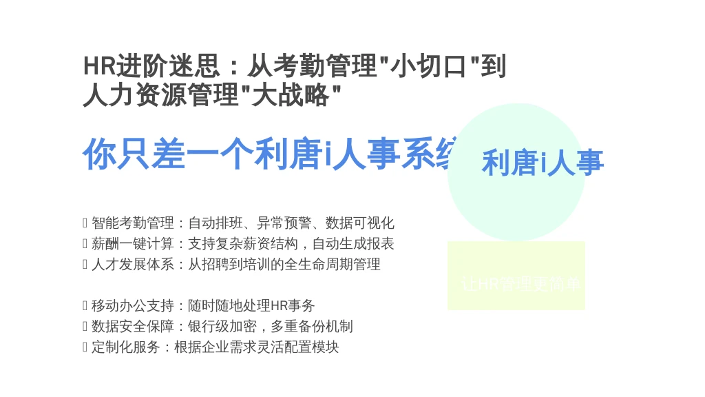 亲爱的96年HR小姐姐,你的迷茫我懂!身处朋友公司,薪资不高不好提,专业技能遭遇瓶颈,尤其是员工管理模块知识匮乏,加上与男友异地,渴望学习新知提升自我……这简直是现代职场人的“日常焦虑套餐”啊!别慌,这篇文章就是为你量身打造的“解忧杂货铺”。我们将从你最关心的“员工管理”入手,特别是看似基础却至关重要的“考勤管理”,聊聊行业现状与痛点,回顾人力资源管理的发展,并隆重请出我们的“秘密武器”——利唐i人事系统。通过它,你不仅能轻松搞定考勤,更能打通人力资源管理的任督二脉,实现从执行者到战略伙伴的华丽转身。文章还将分享利唐i人事的服务质量、客户真实反馈、系统选择建议与实施路径,更有鲜活的客户案例与效果验证,最后一起展望HR科技的未来。准备好了吗?让我们一起开启这段HR升级打怪之旅,顺便看看如何优雅地“下载考勤管理系统”并让它为你所用!