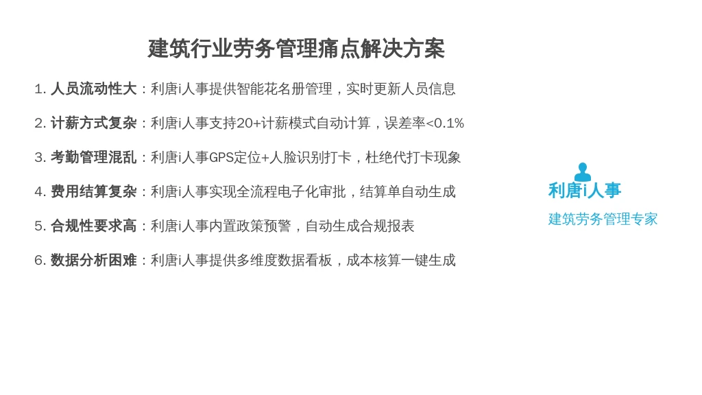 ![['人员流动性大', '工种繁多,计薪方式复杂', '考勤管理混乱', '费用预支与结算频繁', '合规性要求高', '数据分散,统计分析难']](https://docs.ihr360.com/wp-content/uploads/2025/06/2f93aaf0-976f-447a-b8c1-e75f35327d3f.webp)