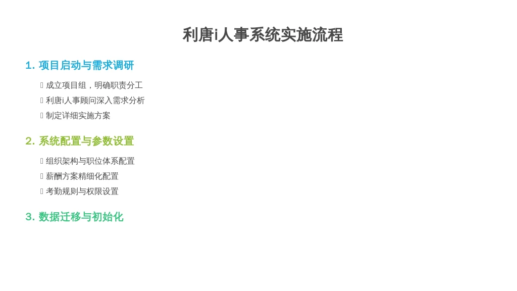 ![['项目启动与需求调研 (Kick-off & Requirement Analysis)', '系统配置与参数设置 (System Configuration & Parameterization)', '数据迁移与初始化 (Data Migration & Initialization)', '系统测试与用户培训 (System Testing & User Training)', '系统上线与切换 (Go-live & Switchover)', '持续优化与售后支持 (Continuous Optimization & Post-implementation Support)']](https://docs.ihr360.com/wp-content/uploads/2025/06/5a1452d5-b936-4f8d-bd19-e3bb344e002f.webp)