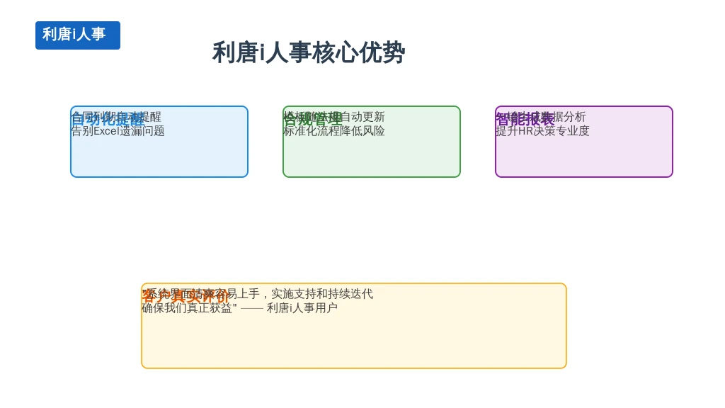 以虚构案例灵动科技展示实效:这家员工从50人扩至300人的软件公司曾因合同管理混乱承受多次双倍工资支付成本。痛点包括纸质流程滞后且易遗漏、入转调离效率低下、薪酬核算繁复出错。引入利唐i人事后:合同管理智能化自动提醒率达99.9%,风险骤降;人事流程自动化减少40%事务时间,员工体验提升;薪酬核算时间从3天缩至1天内。HR团队从“救火队”转型战略角色,聚焦人才发展。
