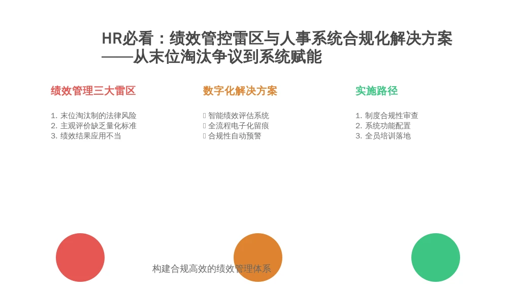 - 系统选型:对比不同厂商的产品,重点看合规功能与自定义性。例如,某厂商的系统支持“绩效目标与员工确认”“考核结果实时反馈”“培训记录关联”,则符合需求。
