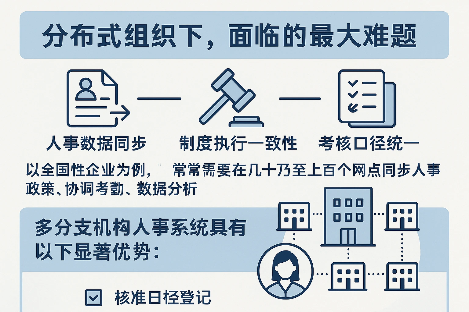 分布式组织下,面临的最大难题来自人事数据同步、制度执行一致性和考核口径统一。以全国性企业为例,常常需要在几十乃至上百个网点同步人事政策、协调考勤、数据分析。多分支机构人事系统具有以下显著优势: