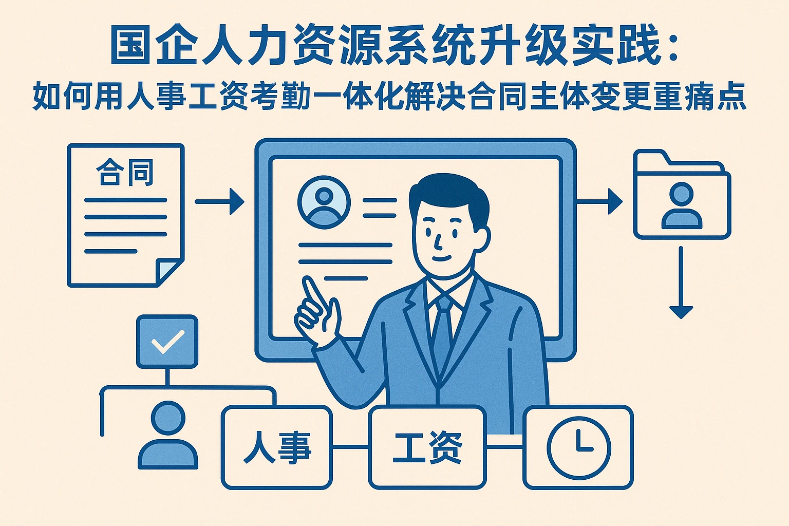 针对上述痛点,国企人力资源系统(尤其是人事工资考勤一体化功能)的核心价值在于通过“数据集中+流程自动化+权益可视化”,将合同主体变更从“风险事件”转化为“管理优化契机”。